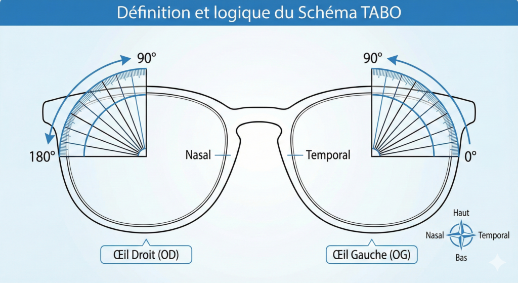 L’acronyme TABO (Technischer Ausschuss für Brillenoptik) définit la norme internationale de notation des axes en lunetterie. Contrairement aux anciens systèmes (comme le schéma Axenfeld ou International), le TABO est le seul langage universellement reconnu par les frontofocomètres et les chaines de montage numérique.